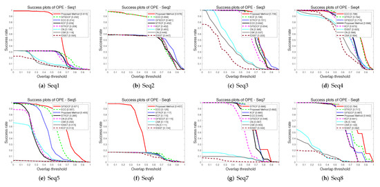 Success plots of eight video sequences involving object sequences without and with occlusion. The legend in the success plot presents the corresponding AUC per object tracker.