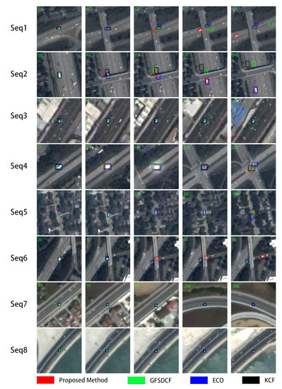All algorithms are carried out on MATLAB 2021. The experimental environment is a Windows 11 system, the Central Processing Unit (CPU) is 2.90 GHz AMD R7-4800h, and the Graphics Processing Unit (GPU) is Nvdia RTX 2060. In the proposed method, the regularization factor is set to , the learning rate is set to 0.012, the search area size is 2.5 times the object size, and the in (22) is set to 0.5. Because the object in the satellite video is small, we set the cell size of the HOG feature used in our method and the KCF tracker to . Because both the ECO tracker and the GFSDCF tracker use the deep feature, these two trackers run using GPU.