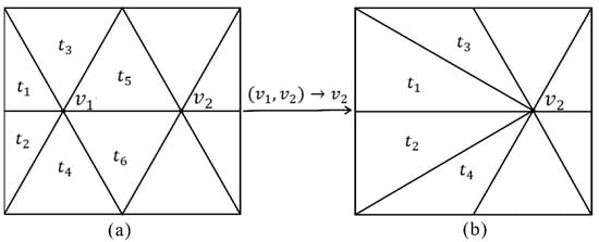 Schematic diagram of the mesh simplification, in which vertex is deleted, vertex replaces as the vertex of triangular patches , and triangular patch is deleted. (a) Unsimplified mesh. (b) Simplified mesh.