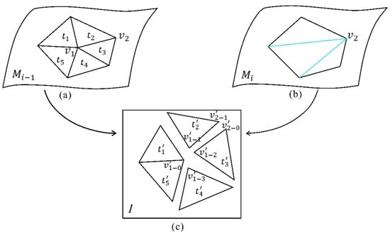 According to the existing algorithm [], the original mesh is merged into a simplified mesh , and the texture distortion and deformation of the model are taken into account during the merging process. The error metric formula constructed in Step 2 of the algorithm tends to merge consecutive texture patches, e.g., and in Figure 2c. For discrete texture patches, e.g., , , and in Figure 2c, the algorithm collects multiple line segment groups before and after collapse. If there is no intersection between the line segment pairs, the calculation of the texture error formula fails and cannot handle such situations. Thus, this algorithm has certain limitations.