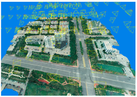 To facilitate the description of the algorithm in this paper, the following provisions are made: the image set generated by “photographing” the reference 3D model scene with the help of the recovered view poses (the camera frustum represented by the red point and the yellow wire frame in Figure 6) is called the reference image set ; the image set generated by “photographing” the real objective world by UAVs (unmanned aerial vehicles), mobile terminals, and other devices is called the real image set .