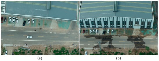 - Data collection by devices such as UAVs or mobile terminals is affected by the time dimension, and images collected at different times in the same area will contain different information such as vehicles, pedestrians, dynamic shadows, and changes in road wetting and dryness, as shown in Figure 9a,b. Therefore, the pixel content extracted from different images for the same facet may be different.