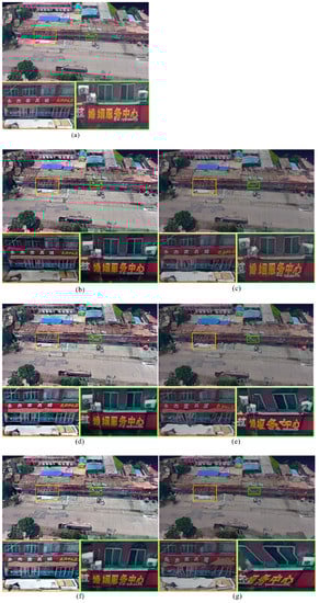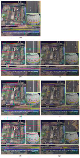 Texture quality comparison of the building area models. The orange and green framework in the upper overall image represent the corresponding local enlarged drawing below the overall image. (a) Original mesh (true value): , number of facets = 109,304. (b) The proposed algorithm: , , number of facets = 54,651. (c) The traditional algorithm: , number of facets = 54,651. (d) The proposed algorithm: , number of facets = 27,326. (e) The traditional algorithm: , number of facets = 27,326. (f) The proposed algorithm: , number of facets = 13,662. (g) The traditional algorithm: , number of facets = 13,662.