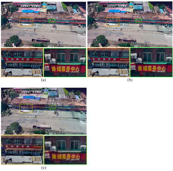 Texture quality comparison of the building area models. The orange and green framework in the upper overall image represent the corresponding local enlarged drawing below the overall image. (a) The proposed algorithm: , , number of facets = 54,651. (b) The proposed algorithm: , number of facets = 27,326. (c) The proposed algorithm: , number of facets = 13,662.
