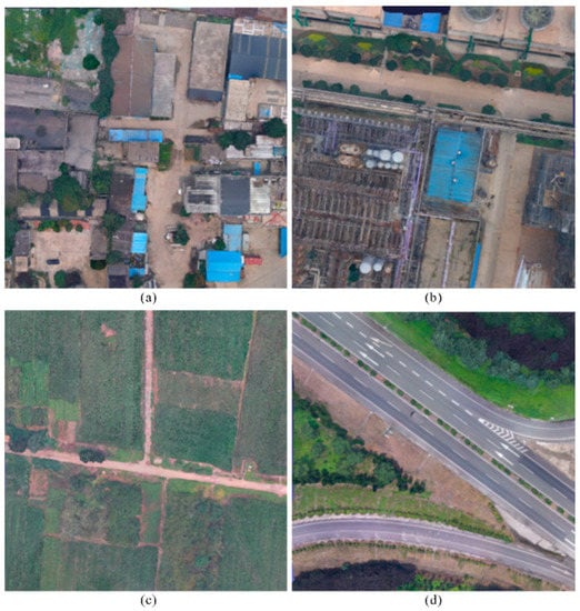 Four types of 3D models of different areas. (a) Residential areas. (b) Factory areas. (c) Vegetation areas. (d) Road areas.