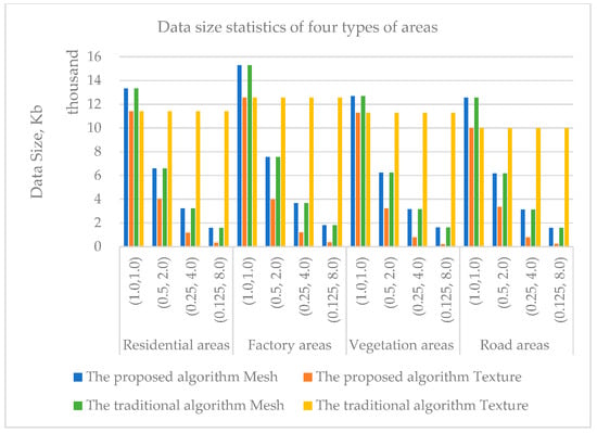 The proposed algorithm can not only simplify the mesh but also reduce the data size of the whole model through texture simplification. Multiple model tiles (with a size of 100.0 m × 100.0 m) were randomly selected from the four representative areas (residential areas, factory areas, vegetation areas, and road areas) as experimental data, as shown in Figure 14. The mesh and texture simplification parameters were set as (1.0,1.0), (0.5, 2.0), (0.25, 4.0), and (0.125, 8.0), respectively. The data size of the proposed algorithm was compared with that of the traditional algorithm, as shown in Table 2, and the bar graph is shown in Figure 15.