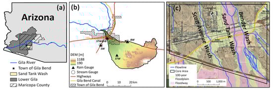 Study area. (a) Location of the town of Gila Bend in Arizona. (b) Digital elevation model (DEM) of the Sand Tank Wash watershed, with relative locations of key infrastructure, precipitation gauges, and streamflow gauges. (c) The core area of Gila Bend, overlaid with flowlines from the USGS and 100-year floodplain and floodway map from FEMA.