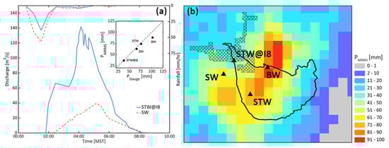 In the late evening of 13 August, additional storm clusters developed across the Phoenix metropolitan area, producing high amounts of rainfall, water ponding, and flash flooding. During the event, the National Weather Service offices in Phoenix, Flagstaff, and Tucson issued a total of 29 flash flood/flood warnings, indicating the large spatial coverage of the event. Clusters of storms developed into a Mesoscale Convective System (MCS) over south-central Arizona at midnight []. As the MCS slowly moved south, areas to the east and south of Gila Bend experienced torrential rainfall and significant flooding. Most of the rainfall fell around 1:00–2:00 a.m. local time, with maximum rainfall intensities reaching 50 mm/h (Figure 2a). Multiple FCDMC gauges received 38 to 102 mm of total rainfall (with the highest amount at BW). According to the FCDMC [], the 1 h rainfall reached the 1000-year return period at the BW station. At the daily scale, the return period of rainfall was 306 years at BW, and 25 to 50 years at STW and SW.