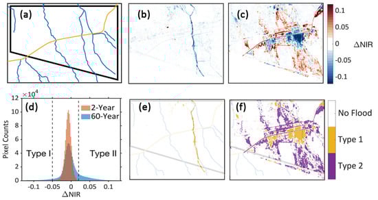 Flood-affected area from CubeSat imagery. (a) The boundary of the core area, with blue flowlines and the yellow Gila Bend Canal. (b) ΔNIR for the 2018 event (2-year return period). (c) ΔNIR for the 2021 storm event (60-year return period). (d) Histogram of ΔNIR for two events. (e) Flooded area in 2018 event, with (a) as reference in background. (f) Same as (e) but for 2021 event. Type I ponded areas have ΔNIR ≤ −0.05 whereas Type II flood-impacted areas have ΔNIR ≥ 0.02.