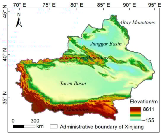 Xinjiang province is located in the northwest of China, deep in the hinterland of Eurasia, bordered by the Pamir Plateau to the west, the Mongolian Plateau to the northeast, and the Qinghai–Tibet Plateau to the south, and connected to Gansu province through the Hexi Corridor to the east. Xinjiang is located between the latitudes 34°40′N and 49°51′N and the longitudes 73°40′E and 96°18′E, and it covers an area of approximately 1.66 million square kilometers. The terrain of Xinjiang is dominated by mountains and basins; the Altai Mountains, Junggar Basin, Tianshan Mountains, Tarim Basin, and the Kunlun Mountains are distributed from north to south (Figure 1). Xinjiang has an arid and semi-arid climate, with average annual rainfall of only 145 mm. The climatic zone of Xinjiang is temperate, but, bounded by the Tianshan Mountains, the northern and southern areas of Xinjiang belong to the arid middle and arid warm temperate zones, respectively. Consequently, Southern Xinjiang is relatively rich in light and heat resources compared with Northern Xinjiang, with glacier snow melt into rivers, creating favorable conditions for agricultural development in arid areas. Therefore, Xinjiang has maintained a land use pattern of “southern farming and northern grazing” for three millennia. In Southern Xinjiang, there is a mixed economy characterized by millet–wheat/barley–animal husbandry, while Northern Xinjiang is dominated by a nomadic economy, and this pattern was maintained until to the end of the 17th century [30].