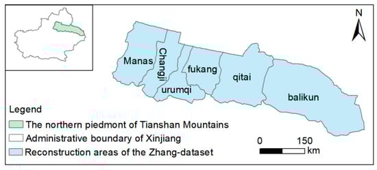 Two regional cropland datasets covering the whole and partial regions of Xinjiang province were utilized in this study, the Ge dataset and Zhang dataset [41,42]. The former dataset reconstructed the provincial-level cropland area of China for AD 1933–1999 by analyzing, comparing, and verifying various survey statistics and relevant research reports covering the Republican period and after AD 1949. For the latter, based on historical records of land use in local historical documents for the Xinjiang area, Zhang et al. estimated the total cropland area for the northern piedmont of the Tianshan Mountains in Xinjiang province for AD 1766–1944 and the corresponding sub-regional-level cropland area for AD 1777–1944, including the Balikun, Qitai, Fukang, Urumqi, Changji, and Manas regions (Table 1, Figure 2).