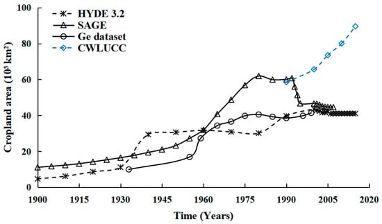 (1) HYDE cropland datasets. Cropland areas in the HYDE datasets for AD 1960–2015 were drawn directly from the FAO data, and for the pre-1961 period, they were estimated using the FAO per capita cropland area and population data for the historical period, assuming that the per capita values for cropland were constant or slightly increased or decreased over time. Then, these cropland areas were allocated to grid cells with a resolution of 5 arc minutes, according to the current spatial patterns reference map of 2010 for cropland, derived from satellite imagery of ESA (2016), and other weighing maps, including population, soil, coastline and river plain, topography, and climate maps [3]. The original version of the HYDE dataset only covered the past 300 years, whereas version HYDE 3.1 extended the reconstruction period to 10,000 BC–AD 2000. The latest version, HYDE 3.2, has updated the basic data on populations and cropland and incorporates allocation algorithms from modern remote sensing.