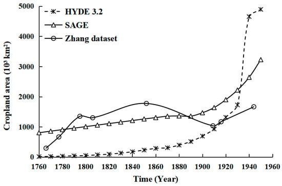 (2) SAGE cropland datasets. Historical cropland cover maps for AD 1700–1992 in the SAGE dataset were derived by the following approach: assuming that the cropland pattern of AD 1992 represents the historical spatial patterns within each political unit, we used political unit cropland inventory data for AD 1992 to calibrate the satellite-based DISCover dataset to obtain a cropland cover map for AD 1992; subsequently, we estimated the historical cropland cover of each political unit based on historical inventory data on population and cropland and calculated the ratio of crop cover in the past to the crop cover in AD 1992 for each political unit, which was then further converted to a spatial map; finally, historical crop cover maps at 0.5° spatial resolution were achieved by multiplying the two maps obtained as above [16]. The initial version of the SAGE dataset covered AD 1700–1992; then, the reconstruction period was extended to 2007, and some original data were also revised, such as Boston University’s MODIS-based global land cover product and the SPOT VEGETATION-based Global Land Cover 2000 dataset, which are used in its latest version.