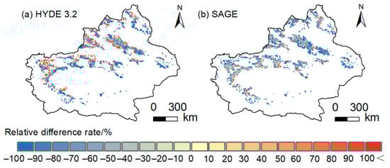 Spatial distributions of the relative difference rate for cropland in Xinjiang province between CWLUCC and the HYDE 3.2 and SAGE datasets for AD 2000.