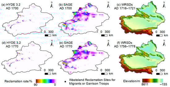 As shown in Figure 7, the cropland spatial distributions for AD 1700 and 1770 are relatively close to those for AD 2000 at the provincial scale from HYDE 3.2 and SAGE, all indicating that the cropland of Xinjiang province is mainly distributed in the oasis areas, such as the two sides of the Tianshan Mountains, the south side of the Altai Mountains, and the north side of the Kunlun Mountains, and sporadic cropland can be found in Eastern Xinjiang. However, historical records on the wasteland reclamation sites for migrants or garrison troops in the Xinjiang area reveal that the cropland was sporadic and mainly distributed in Eastern Xinjiang, which was controlled by the Qing government during the early Qing Dynasty (AD 1716–1721), while the land use in Northern Xinjiang was still dominated by grazing (Figure 7c). After this, the wasteland reclamation sites for migrants or garrison troops in Xinjiang gradually expanded westward with the expansion of the territory of the Qing government, and the cropland began to spread throughout the northern and southern regions of the Tianshan Mountains during the mid-Qing Dynasty (AD 1756–1778) (Figure 7f). However, for this period, the wasteland reclamation sites for migrants or garrison troops were still not established in the south side of the Altai Mountains. As confirmed by previous studies, the cropland expansion of the Xinjiang area displayed a process of change from south to north and from east to west in the Qing Dynasty, and Northern Xinjiang experienced a significant transformation in land use from grazing to agriculture under the influence of the immigrant reclamation policy “migration to strengthen frontier defense” of the Qing government [20,34]. This observation indicates that the two global datasets have large uncertainties in cropland spatial patterns for the Xinjiang area for the historical periods.