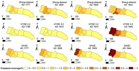 Comparison of changes in cropland coverage in the northern piedmont of the Tianshan Mountains between the Zhang dataset, HYDE 3.2, and SAGE for AD 1777, 1810, 1910, and 1944.