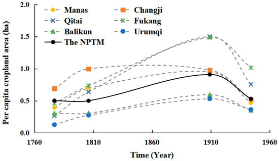 Computed regional and sub-regional per capita cropland areas in the Zhang dataset. The NPTM represents the northern piedmont of the Tianshan Mountains.