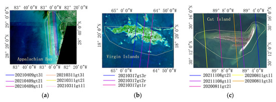 Sentinel-2 true-color images of study areas. (a) Appalachian Bay. (b) Virgin Islands. (c) Cat Island. The colored lines in the figure are the ground track data of ICESat-2 used in the study.