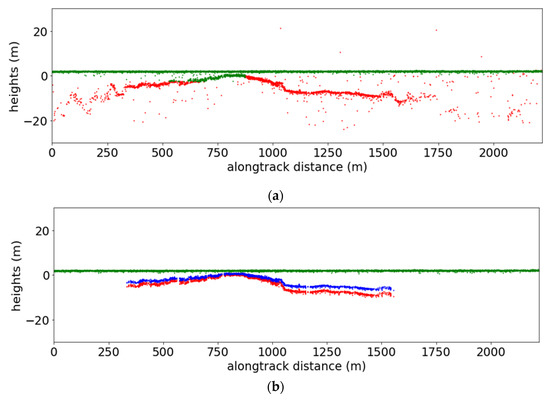 Diagram of ICESat-2 before and after processing. (a) Pre-processing point cloud. (b) Point cloud after filtering and refraction correction. The green points represent the sea level, red points show the initial extracted seafloor topography, and the blue points show the refraction-corrected seafloor topography.