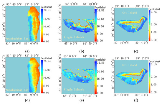 As can be seen from Table 4, the depth inversion accuracy of the DL-NB model is higher than the other three methods in each study area. Notably, another finding is that Cat Island has the highest accuracy, which is much higher than Virgin Islands. This may be explained by several reasons. One potential reason is that deeper water makes the water column more complex, and the inversion accuracy of the DL-NB model decreases with the increase of water depth. In addition, the water quality, underwater topography and cover types in different study areas are different. The underwater terrain of the Appalachian Bay is relatively flat, and the underwater cover of the Virgin Islands is more complex, which may affect the results of depth inversion as well.