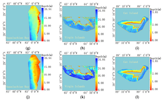Bathymetric maps of four study areas. (a–c) are the Bathymetric maps of Appalachian Bay, Virgin Islands, and Cat Island obtained through the DL-NB. (d–l) are acquired from linear regression, multilayer perceptron and random forest respectively.