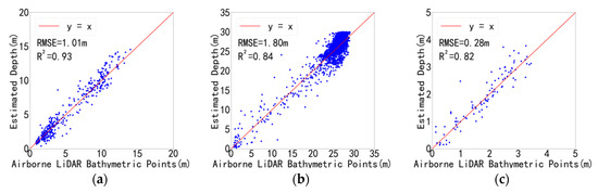 The correlation between the satellite-derived bathymetry (SDB) and in situ bathymetric points captured by the airborne LiDAR system was illustrated by scatter plots in each study area. As shown in Figure 5, the red line is the y = x line. Although the validate points are not evenly distributed, generally there is a strong correlation between the SDB and the in situ data. To further evaluate the performance of the DL-NB, R2 and RMSE between the retrieved water depths and in situ depths in three study areas were calculated and a comparison of accuracy with baselines were summarized in Table 4.