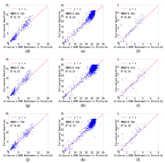 Scatter plots drawn by the retrieved water depth values of the test sets and the water depth labels of the test sets in the four study areas. (a–c) are the scatter plots of Appalachian Bay, Virgin Islands, and Cat Island obtained through the DL-NB. (d–l) are acquired from linear regression, multilayer perceptron and random forest respectively.