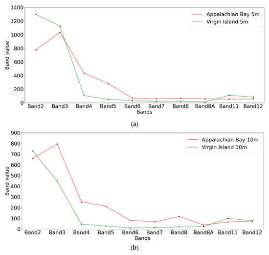 The data pre-processing is important to obtain a more accurate bathymetric map. Besides, there are many other factors affecting bathymetric results, including seawater turbidity, water column conditions and bottom type, etc. It makes sense to check the portability of the model in different environments. Based on the DL-NB, cross-validation was performed between the Virgin Islands and the Appalachian Bay. The DL-NB model was trained in one area and used in another. The validation result is shown in Table 5 indicates that the portability of the DL-NB model is poor. A possible reason is that there is great diversity in underwater terrain and coverage types among these areas, which will be reflected in the pixel values of remote sensing images. Figure 7 illustrates the average band value curves of 5 m and 10 m water depth in the same period of the US Appalachian Bay and the US Virgin Islands. There are great differences in the band values curve at a certain water depth in different study areas. Therefore, it is difficult to apply the trained model in one area to another different area for bathymetry.