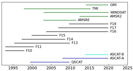 Times that each satellite contributes to CCMP. Scatterometers are shown in blue, and radiometers are shown in black (SSM/I series,) and green. Those shown in green include the lower frequency 11 GHz channel. ASCAT-B is shown in light blue because it is withheld from CCMP and is instead used as a source of validation winds.