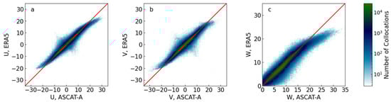 2-D histograms of zonal wind (U) (a), meridional wind (V) (b) and wind speed (W) (c) for current-correct ERA5 and ASCAT-A for an example month, January 2015. Above about 17 m/s, ERA5 wind speed are systematically lower than ASCAT-A wind speed. A very similar pattern is seen in the vector components, motivating the use of a multiplicative adjustment. Note that the color scale is logarithmic to make areas with relatively low number of collocations easy to see at the expense of making the overall scatter away from the diagonal appear wider. The features in (a,b) roughly perpendicular to the diagonal do not contain many collocations. These are likely caused by relatively rare, incorrect selections for the correct “ambiguity” in the wind direction in the scatterometer retrieval.