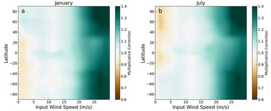 Color-coded representations of the wind speed adjustment factor applied to ERA5 winds as a function of ERA5 wind speed and latitude. We show the adjustments for two example months, January (a) and July (b). Adjustments for all other months are qualitatively similar, except for the seasonal variation of the low-speed corrections described in the text.