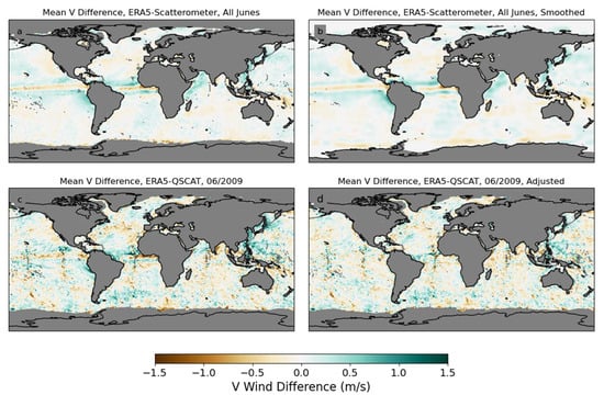 After the wind speed adjustments are applied, some regional differences in the vector components remain. The spatial patterns of these differences suggest that they are at least partly related to stability conditions, as large values occur over the Inter-Tropical Convergence Zone (ITCZ) and areas of persistent currents that cause perturbations in the sea surface temperature. They may also be related to errors in the adjustment made for ocean currents. Since these differences are fairly constant from year to year and are similar for QuikSCAT and ASCAT-A, but with substantial seasonal variations, we remove them by subtracting a spatially smoothed, seasonally varying mean ERA5-scatterometer difference, averaged over both the QuikSCAT and ASCAT-A missions. The smoothing is performed by fitting the differences to a series of spherical harmonics Ylm, with l extending from 0 to lmax = 40. We choose this value of lmax so that the smoothed version largely preserves the sharp feature near the ITCZ in the tropical Pacific, but removes most of the noise on shorter (<~5 degrees) distance scales. An example of the regional adjustment for meridional wind over the month of June is shown in Figure 5. The adjustments applied for both zonal and meridional winds for each month of the year are shown in Figure A1 and Figure A2 in Appendix A.