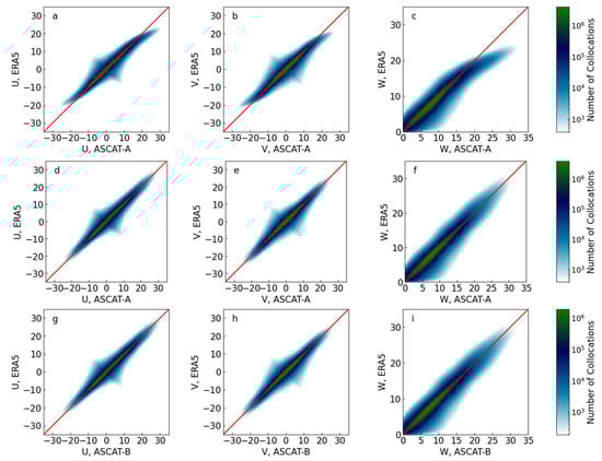 Two-dimensional histograms of ERA5 winds as a function of scatterometer winds. The top row (a–c) shows the results using unadjusted ERA5 neutral stability winds and ASCAT-A winds. The second row (d–f) shows the results for ERA5 and ASCAT-A winds after the adjustment for ocean currents, speed adjustments and vector components were applied. The bottom row (g–i) is similar to the middle row, except for collocations with ASCAT-B winds were used. Note that ASCAT-B results were not used to derive any of the adjustments, confirming that the adjustments applied to ERA5 are not idiosyncratic differences arising from features of a single instrument.