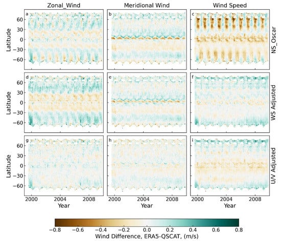 Hovmöller diagrams of ERA5—QuikSCAT wind differences for 2000–2009. Panels (a–c) show the differences for zonal wind, meridional wind, and wind speed when only the ocean adjustments for currents are applied to ERA5. Panels (d–f) show the same differences after the wind speed adjustment was applied. Panels (g–i) shown the final results after the regional vector-component biases are also removed. Results for ERA5—ASCAT-A are similar (see Figure A3).