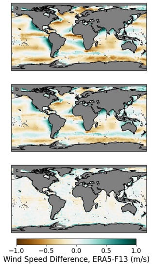Global maps of the differences between ERA5 and SSM/I F13, averaged over 1996–2009. (a) shows the differences relative to ERA5_OSCAR. There are large regional biases, with several areas showing average differences as large as 1 m/s. (b) shows the differences relative to ERA5_ADJ. The adjustments applied to ERA5 reduced the ERA5-F13 differences, but substantial regional differences remain. After regional wind speed adjustments were applied to the F13 winds, the differences are much reduced (panel c). We note that the corrections applied to F13 was derived using all Rad_MED instruments (F10, F11, F13, F14, F15, F16, F17 and F18). The success of these adjustment for F13 indicates that the differences are consistent across instruments of the same type.