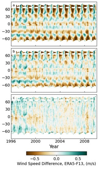 We next compare ERA_ADJ winds to winds retrieved from imaging radiometers. Radiometer measurements are important for extending CCMP to the pre-scatterometer period. For this analysis, we separate the radiometer instruments into two sets, one (Rad_LO) that includes instruments that have a lower 11 GHz channel (TMI, AMSR-E, AMSR2, WindSat and GMI) and a second set (Rad_MED) consisting of instruments whose lowest frequency channel is 19 GHz (SSM/I and SSMIS). Winds from the Rad_LO instruments are less affected by atmospheric conditions because of the increased atmospheric transparency at lower frequencies [24]. Global maps of the mean ERA5-SSM/I F13 differences are shown in Figure 8. Panels (a) and (b) show the differences for the ERA5_OSCAR and ERA5_ADJ winds. In both cases, there are large regional differences, with a small improvement when ERA5_ADJ winds are used in place of ERA5_OSCAR. We note that the overall statistical consistency between ERA5_ADJ and SSM/I F13 is good as indicated by wind speed histograms and mean differences binned by wind (not shown). Hovmöller diagrams (Figure 9) show that the differences are also strongly modulated by the seasonal cycle in regions more than about 25 degrees away from the Equator. Similar plots are shown for AMSR-E, a Rad_LO instruments, in Figure A4 and Figure A5 in the Appendix A. In both cases, the differences are large enough to make it advantageous to adjust the radiometer winds before including them in CCMP. To do this, we adjust both the Rad_LO and Rad_MED withs so they agree with the adjusted ERA5 winds. We calculated monthly mean differences between each type of radiometer and adjusted ERA5 winds by averaging over the complete missions of each set of radiometers. Only AMSR-E, AMSR2 and WindSat were included in the calculation of the Rad_LO means because TMI and GMI do not sample all latitudes due to their more inclined orbits. All Rad_MED instruments were included in the Rad_MED averages. The monthly mean adjustments for each month and radiometer type are shown in Figure A6 and Figure A7. Similar to the adjustments made to ERA5, the adjustments made to the radiometers are performed by interpolating the monthly maps to the day being adjusted. Panels (c) in Figure 8, Figure 9, Figure A4 and Figure A5 show the differences after the adjustments were applied.