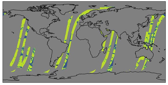 Map of collocations between ASCAT-B and CCMP for an example day (1 January 2018), for the ascending passes of ASCAT-B. Locations where CCMP included a satellite observation from any satellite (SAT) are shown in yellow and locations without a satellite in CCMP (NOSAT) are shown in blue. NOSAT collocations occur for two reasons: (1) Satellite observations were excluded from CCMP because of rain contamination. These are the irregularly shaped regions spread across the map. (2) The existence of gaps between satellite swaths even when all satellites are included. For this day/node, this only occurs in the Southern Ocean and on the extreme left side of a few swaths near the equator. The locations of the satellite gaps vary over time as the swaths for the other satellites drift with respect to ASCAT-B.
