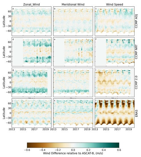 Maps such as those shown in Figure 11 and Figure 12 do not provide any information on the time dependence of the ASCAT-B-CCMP differences. To investigate the time dependence, in Figure 13 we show Hovmöller diagrams of the difference between ASCAT-B winds and three versions of CCMP, as well as ocean-current-adjusted (but not speed adjusted) version of ERA5. Differences with ERA5 (panels j–l) show large seasonal differences in wind speed poleward of 30 N and 30 S. Part of these differences are caused by the negative bias in ERA5 at higher wind speeds more common in each hemisphere’s winter months. Differences with CCMP 2.0 (g–i) show latitude-dependent biases in zonal wind and wind speed, as well as a decreasing relative trend in CCMP 2.0. Differences with CCMP NRT (d–f) (which begins in January 2015) also show latitude dependent biases, particularly in zonal wind. CCMP ADJ (a–c) shows smaller differences than any of the previous versions or ERA5, though there is still a small increasing trend in CCMP ADJ wind speed differences at most latitudes, perhaps caused by small trends in radiometer wind retrievals relative to ASCAT-B.