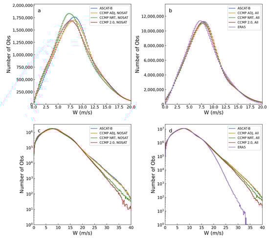 Histograms of wind speed for ASCAT-B, three version of CCMP and ERA5. Panels (a) and (c) show the results for collocations without satellite observations in CCMP, and (b,d) show all colocations. Panels (a–d) are identical except for the vertical axis, which is displayed in logarithmic form in (c,d).