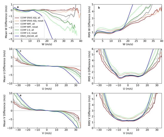Binned mean differences and RMS differences between wind and ASCAT-B. The left column (a,c,e) shows the mean differences for W, U, and V as a function the average wind between the wind variable pairs. The right column (b,d,f) shows the RMS differences. In all cases, CCMP ERA5 ADJ shows better agreement with ASCAT-B than the other wind datasets.