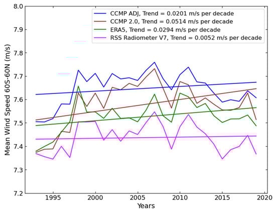 Time series of annual, globally averaged (60S–60N) mean wind speed for two versions of CCMP, ERA5_OSCAR, and merged RSS radiometer winds.