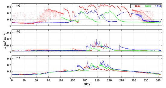 The variations of hourly soil moisture (θ, m3 m−3) at the depth of 0.10 m at (a) BJ, (b) QOMS, and (c) NADORS for 2014–2016. Note that θ was measured at 0.04 m depth at BJ 2014, θ at NADORS were the arithmetic mean of soil moisture measured at the depths of 0.00 m and 0.20 m, and θ were directly measured at the 0.10 m depth for other cases.