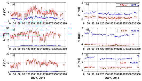The hourly soil temperature amplitude (A) and phase (Φ) at two depths were extracted from soil temperature time series using DHR. For simplicity, only the 2014 results at the three sites are presented as illustrated in Figure 3, and the other results are shown in Figures S2–S4. The data were removed as A at 0.20 m depth was less than the corresponding threshold value at each site.
