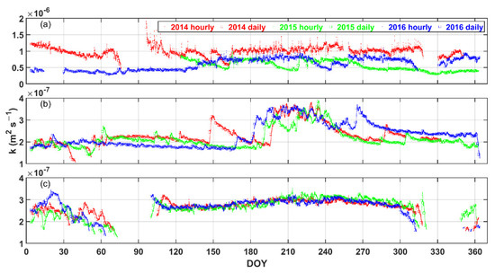 After obtaining hourly A and Φ values for soil temperature at the first depth and the 0.20 m depth, hourly k was determined with Equation (2). The daily k was also obtained by averaging the hourly values over a day. The variations of the hourly and daily k for 2014–2016 at the three sites are shown in Figure 4.