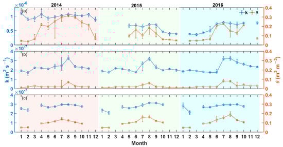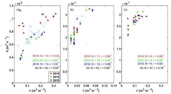 The k values at QOMS and NADORS were much less than those at BJ (Figure 4 and Figure 5). In addition to the soil moisture (Figure 2), the soil bulk density at QOMS and NADORS was expected to differ from that at BJ, since their soil types were sand and gravel, whereas BJ’s soil type was sandy silt loam. Previous studies indicated that k varied with bulk density as well as soil moisture [17,18,59,60,61]. Therefore, the combined effects of the soil texture, moisture and bulk density resulted in the relative magnitude of k at the three sites. At BJ, the k values in 2014 were much larger than those at 2015 and 2016 (Figure 6a–c). The main reason may be due to differences in soil bulk density and soil moisture content.