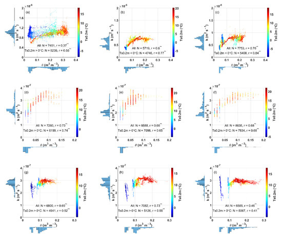 The relationship between k and θ on a daily timescale (Figure S5) was similar to that on an hourly timescale. Few studies have investigated the relationship between k and θ for soil below and above the freezing temperature simultaneously.