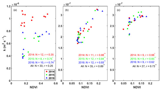 Same as Figure 7, but for the relationship between k and NDVI. “*” indicates p-value < 0.05, “**” indicates p-value < 0.01, and there is no label after r if r is not significant (p-value > 0.05).