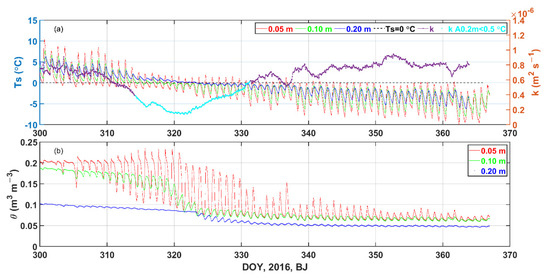 The (a) soil temperature (Ts, °C) at the depths of 0.05 m, 0.10 m and 0.20 m, and soil apparent thermal diffusivity (k, m2 s−1), and (b) soil moisture (θ, m3 m−3) at the depths of 0.05 m, 0.10 m and 0.20 m over DOYs 300–365, 2016, at BJ. The labels of k are marked in cyan when the soil amplitude at the 0.2 m depth is less than 0.5 °C.