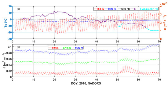 The (a) soil temperature (Ts, °C) at the depths of 0.0 m and 0.20 m, and soil apparent thermal diffusivity (k, m2 s−1), and (b) soil moisture (θ, m3 m−3) at the depths of 0.0 m, 0.10 m and 0.20 m over DOYs 0–70, 2016, at NADORS. The labels of k are marked in cyan when the soil amplitude at the 0.2 m depth is less than 0.1 °C.
