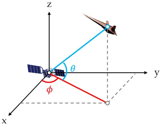 Satellites operating in low orbits are applied to detect the target. As shown in Figure 1, a single satellite can provide two measurements of the target through processing SAR images, consisting of the azimuth, , and the elevation angle, . The detecting coordinate system is paralleled to the Earth-Centered Inertial (ECI) [].